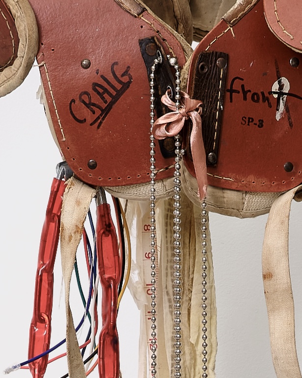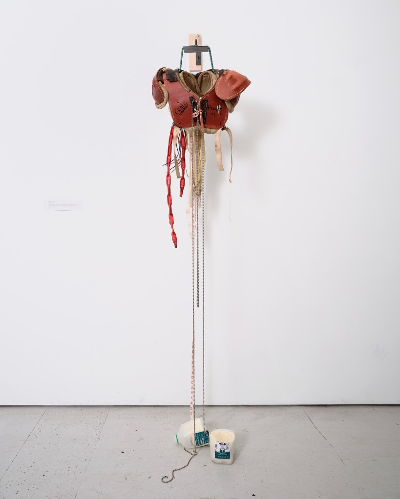 Ranciere recognized collage for its rarefied ability to suspend what cannot otherwise be aligned. It opens a passage of a third political sphere between dissident forms. Casey Correa understands that we are unable to step outside of the hegemonic desire economies of the patriarchy, but her work is situated between belonging within it and desiring an outside of it. Correa wants to know how the majority constructs our conception of the ordinary. The cleaning products, the ironing boards, and the football pads each annotate this heavily manufactured “ordinary” of American suburban life; an ordinary that reinforces the white patriarchal and conservative notions of domesticity and the family. Correa’s work acknowledges its desire to fit into the glamorous world of Pop through Euphoria and Real Housewives, while also suspecting that it generates a difference and lack within it. But while these symbols advance, behind them are clever quotations to the history of art when it most closely aligns with these broader desires. Correa revamps Rauschenberg’s combines so as to see what happens when it revisits us as a spectre from America’s past. In graceandgravity (2025), Warhol’s Triple Elvis becomes Triple John Mayer on an ironing board. The quotations within quotations remind us that culture produces endless celebrity, fulfilling the silhouette of those that came before with new, but familiar, forms.