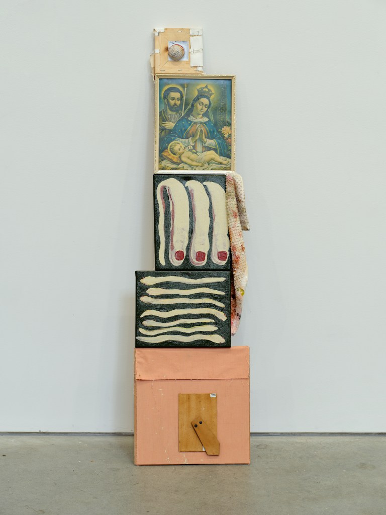 High up on the window in please, please, please (I’ve got dreams to remember) (2025) is an image of the pro-wrestler American Nightmare. In the canon, his father was American Dream. Out of the window is a bandana ladder–– a way out from between the father and son and the twisted dream that they’ve formed together. Correa’s collages seek to take things beyond the body, beyond the house, where things enter in as gendered forms of control and power and leave uncoupled and unfamiliar to us, their symbols denatured into strange and unfamiliar forms.