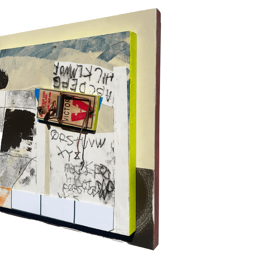 Casey Correa’s assemblage lays bare the back of the canvas, adorning it with found objects like mousetraps and a stuffed Shamu. She plays with colors, images and words in an anthropological exploration of the detritus of contemporary life.